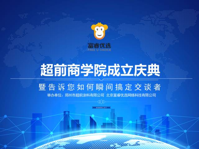 2017年04月19日,超前商學(xué)院成立揭牌啟動(dòng)大會(huì)在鄭州隆重召開(kāi),鄭州市超前涂料董事長(zhǎng)、北京富睿優(yōu)選選董事長(zhǎng)—閻運(yùn)鋒,人社部高級(jí)人力資源管理師、WFA國(guó)際促動(dòng)師協(xié)會(huì)行動(dòng)學(xué)促動(dòng)師—代志杰,中國(guó)智慧策略應(yīng)用專(zhuān)家、企業(yè)運(yùn)營(yíng)管理專(zhuān)家、飛漲策略(北京)品牌管理有限公司董事長(zhǎng)—董建明等50多位企業(yè)家與公司員工出席本次活動(dòng)。