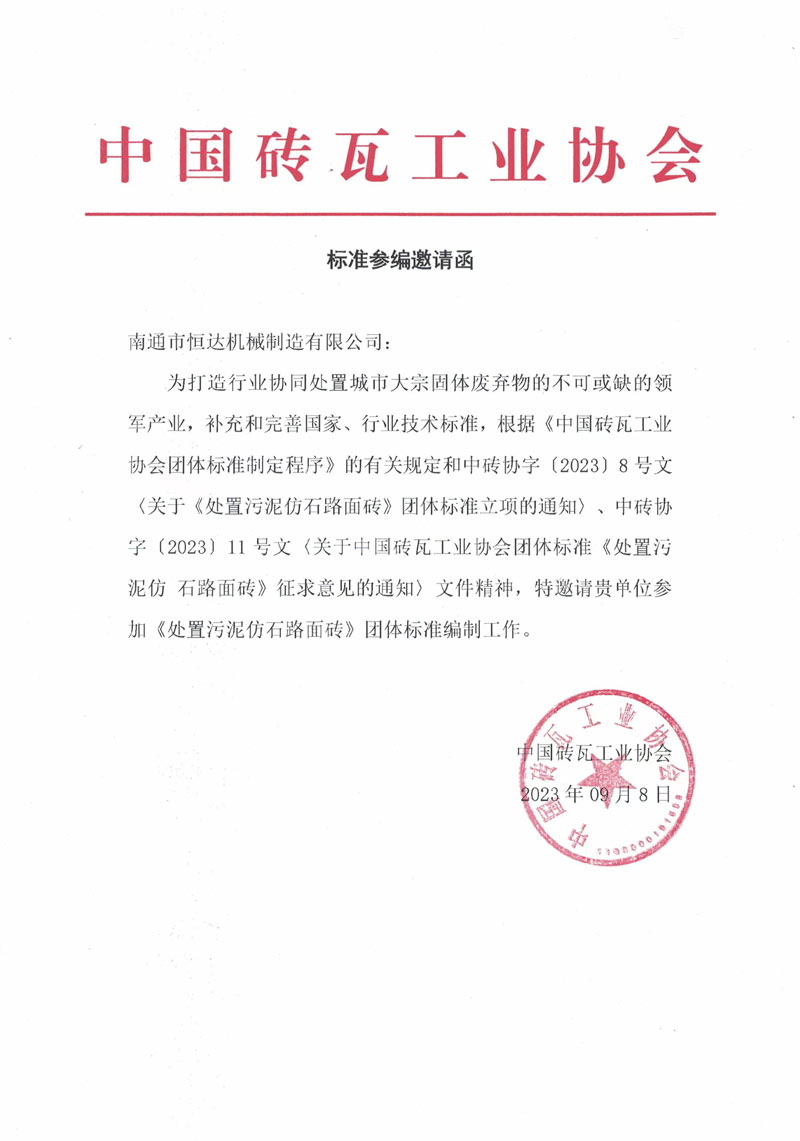 行業(yè)要健康發(fā)展,標準必須先行。再此背景下,2023年10月21-22日,在中國杭州,中國磚瓦協(xié)會及時的組織了行業(yè)骨干企業(yè),群策群力,制定高質量標準。南通市恒達機械制造有限公司董事長崔恒全和技術總工于銀龍受邀請參加,為標注的制定貢獻恒達力量。